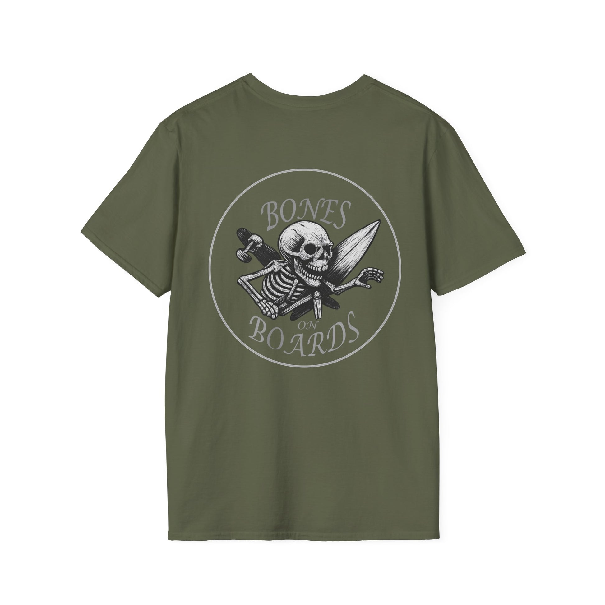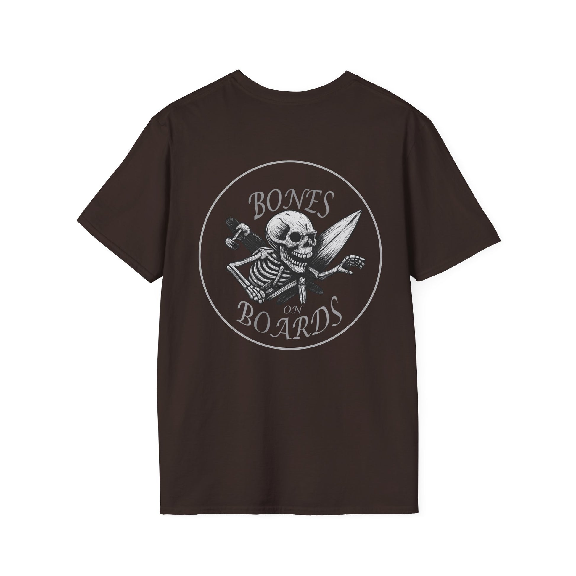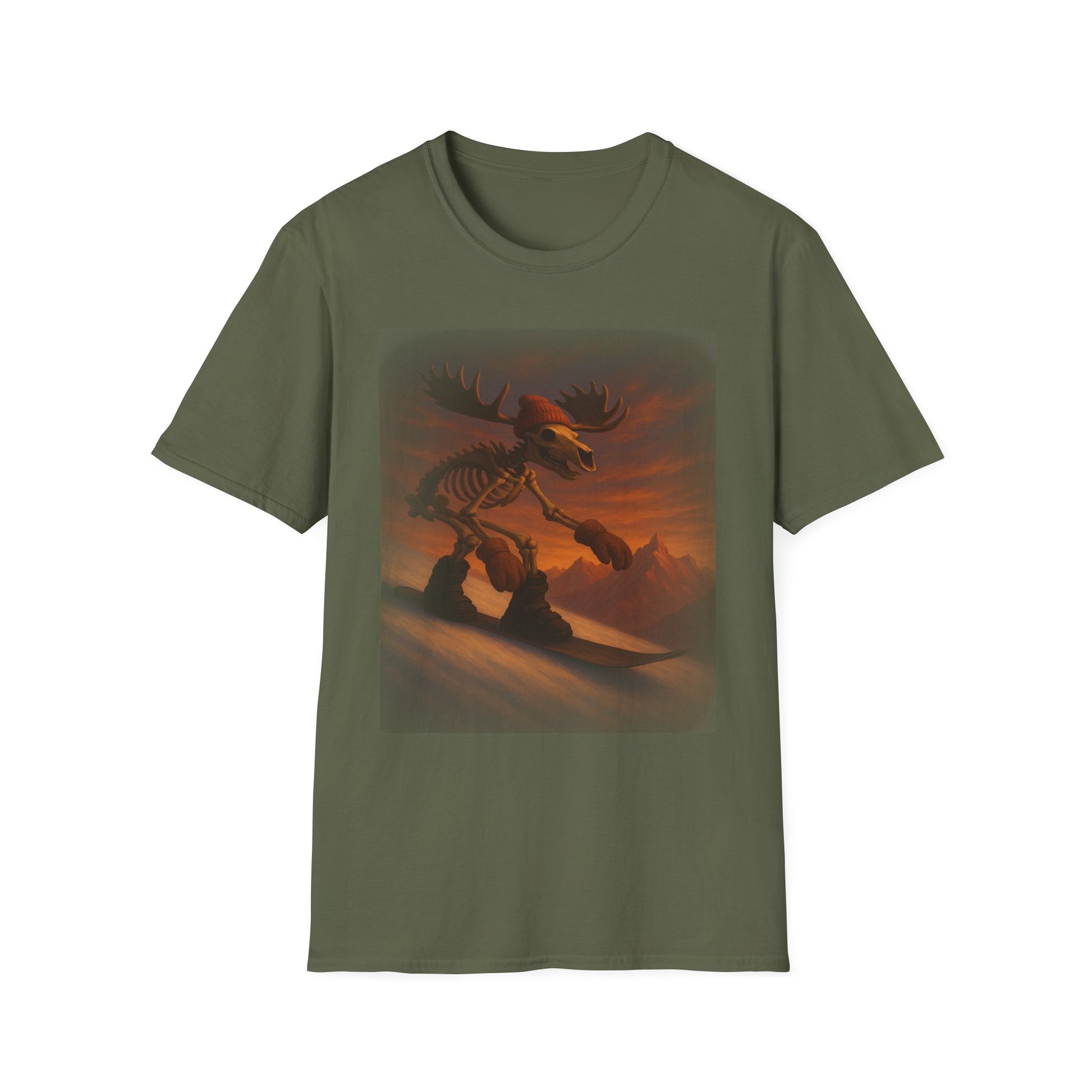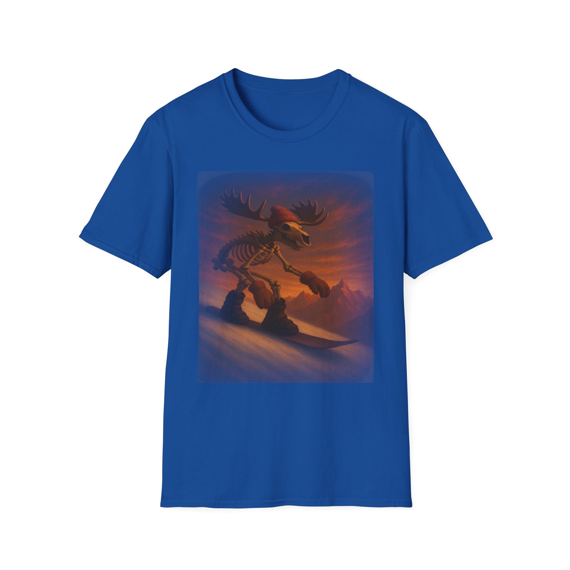 This soft, year-round tee brings a bold mix of winter adventure and playful edge. The front showcases a dramatic skeleton moose charging down a snowy slope at sunset — rich, warm colors that instantly draw attention. On the back, the classic “Bones on Boards” logo adds a cheeky outlaw-surf vibe that ties the whole look together.