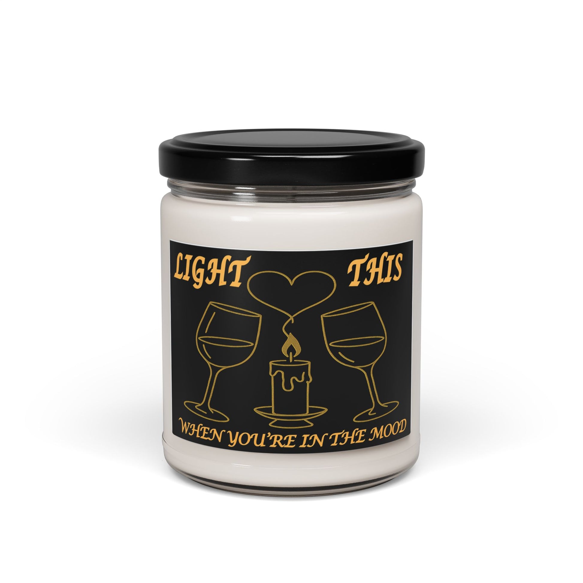 This elegant gold-line illustration features two clinking wine glasses beside a warmly glowing candle, with heart-shaped smoke rising above the flame. Beneath the artwork sits the playful message: “Light this when you’re in the mood.”